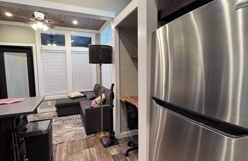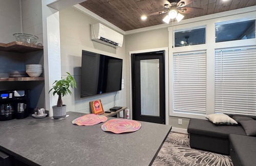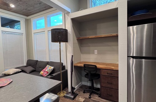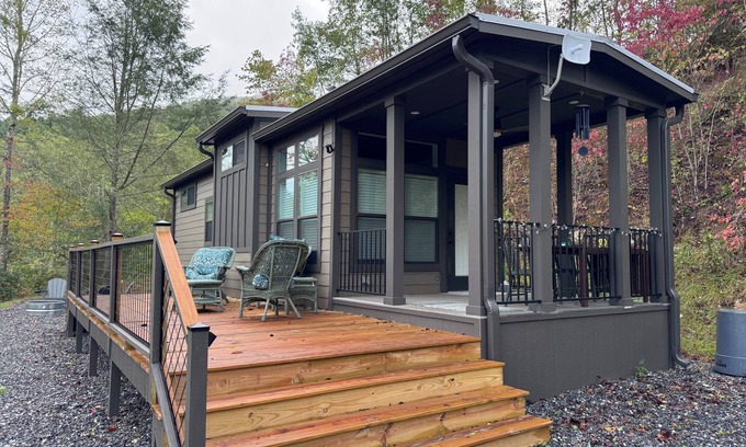 Your cozy Tiny Home. in Franklin with 1 lovely bedroom featuring a queen bed. This charming retreat includes WiFi, a washing machine, and AC. The bathroom comes equipped with a hair dryer and shower. Kickback, relax, and enjoy everything Cowee Valley and our Tiny Home has to offer