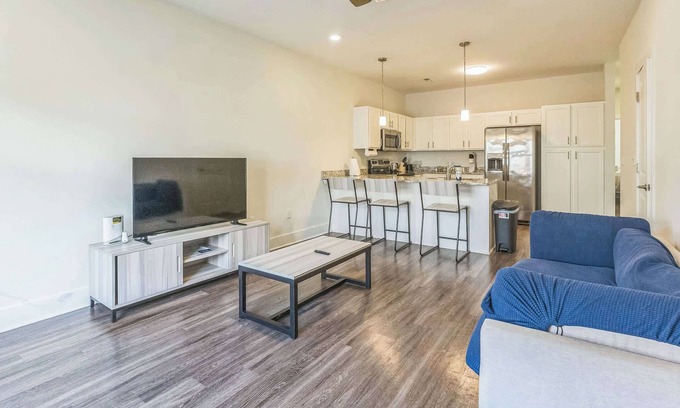 This stunning townhome offers a contemporary, open floor plan designed for modern living. Each spacious bedroom features a private bathroom and walk-in closet, ensuring both comfort and privacy. The kitchen is outfitted with stainless steel appliances, including a refrigerator, oven/stove, microwave, toaster, and a Keurig coffee maker for your morning brew. The living room, with its couch and coffee table, is perfect for relaxing or entertaining. Enjoy complimentary Wi-Fi and modern fixtures, along with a washer and dryer, all wrapped in eclectic design touches that blend style and functionality.
