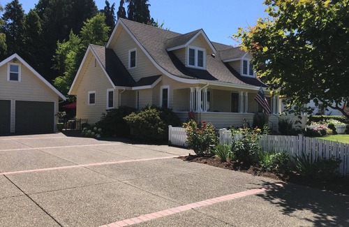 Nestled in a quiet neighborhood, this 1940s home is 2600 sq ft. and professionally decorated. Air conditioning on both floors. Oak antique furniture fill every room. Interesting artwork adorn the walls including a hallway filled with prints depicting Eugene in early 1900s by the late George Werner. Upon entry you walk into a cove-ceiling living room with a fireplace to the right and a formal dining room with seating for 8 to the left. Dinnerware, place mats/chargers and cloth napkins available upon request for dinner parties. Fully equipped kitchen including a tv, with a small eating bar and a separate breakfast nook with seating for 4-6. Cozy tv room, one queen bedroom downstairs next to a full bath with a large soaking tub and shower. Three bedrooms upstairs - two double beds and one queen-sized bedroom with tv and en suite bathroom. Two full bathrooms with showers upstairs. Large driveway with room to park multiple cars plus a motor home, a private park-like backyard surrounded by tall cedar, dogwood and maple trees, roses, rhododendrons and hydrangeas with a concrete patio and BBQ grill for outdoor dining. Patio is large enough for a seated dining group of 18. Covered front porch with seating for evening cocktails and view of the rose garden. Pack & Play crib available upon request. Wi-Fi, cable tv. Washer & dryer available.