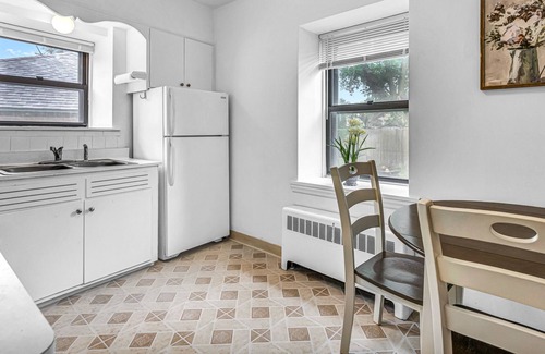 The fully equipped, early Americana-style chef’s kitchen has original wood cabinets and woodworking, vintage formica countertops, large windows and retro-style linoleum tile floors. The eat-in area has a small dinette with seating for three, beside a large window with views of the lush, historic neighborhood.
