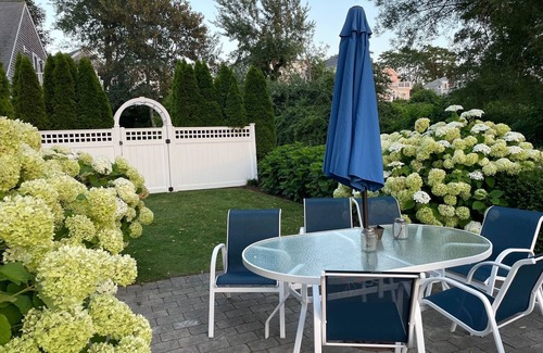 A charming 4 bedroom, 3.5 bath cape with large kitchen, private backyard, includes all amenities, patio and deck that abuts conservation land. Located on a dead-end, quiet lane in the center of town just off Main Street in quaint Chatham village. Walk to shops and restaurants. Oyster Pond beach (0.2 mile / 6 min walk). 1 min walk to Viera on Main bar and restaurant. Chatham Squire a 5 min walk. Lighthouse Beach a 20 min walk and less than a 5 min drive. Chatham A's ballpark 8 min walk. All beaches with in a 10 min drive.