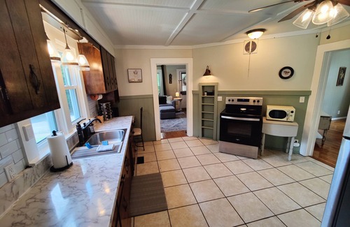 This home has been recently updated while still respecting some of the original 1940's charm. There are beautiful hardwood floors throughout most of the house, antique cabinets in the kitchen, a shaded front porch where you can observe the neighborhood, and an uncluttered old fashioned feel to the whole home. The kitchen is large and open, stocked with dishes and appliances, and is adjacent to the comfortable living room and dining room. Both the King Bedroom and Full Bedroom Loft are located upstairs, and the Queen Bedroom is located on the main floor. Both bathrooms are also located on the main floor of the home. This cozy stay is full of character and functionality for the whole family.