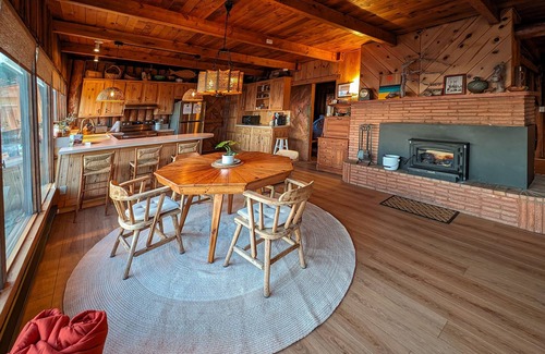 Inside, instantly feel welcomed by the warm wood finishes, carefully curated decorations, and ample natural lighting. The open-concept living room, dining room, and kitchen blend together perfectly. Put a log on the wood-burning fireplace and stream your favorite shows from the comfort of the plush sofa.