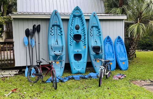 There is a boat ramp at McRaes’s down the road and your small boat can be stored at our dock. Culvert access to the Homosassa River. This property also includes use of five kayaks and two bicycles.