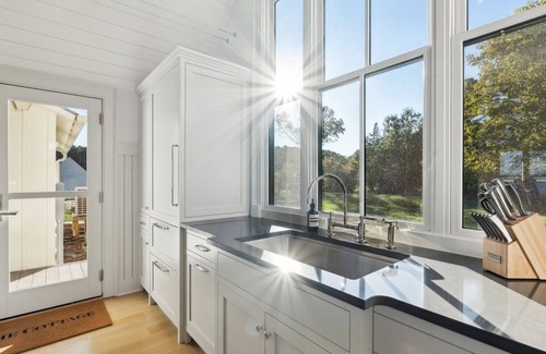 Inside, the light-filled interiors boast modern finishes with a rustic charm, featuring a gourmet kitchen with a butcher block island, vaulted ceilings, and an open floor plan perfect for romantic weekend for two. Unwind by the cozy fire stove, enjoy an optional chef-prepared gourmet meal in the kitchen served at your table, or simply relax in the sunlit living room with floor-to-ceiling windows showcasing breathtaking views of the water.