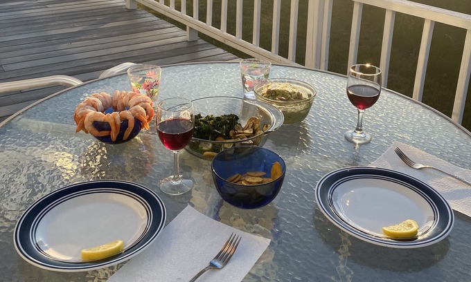 Large studio located on waterfront estate with four "ocean liner" bunks and a pull out trundle that converts to a king size bed. Fully equipped kitchen, full bath, laundry room, Netflix, , Amazon Prime, wifi, satellite, sitting area and deck with table and lounges. Towels and linens provided. Cottage comes with the use of two kayaks, boat ramp, dock and 3 shared bikes. Expresso maker, gas grill, charcoal grill, and local babysitter within walking distance. Waterfront has herons, egrets, eagles, blue birds and purple martins. You can crab off the dock.