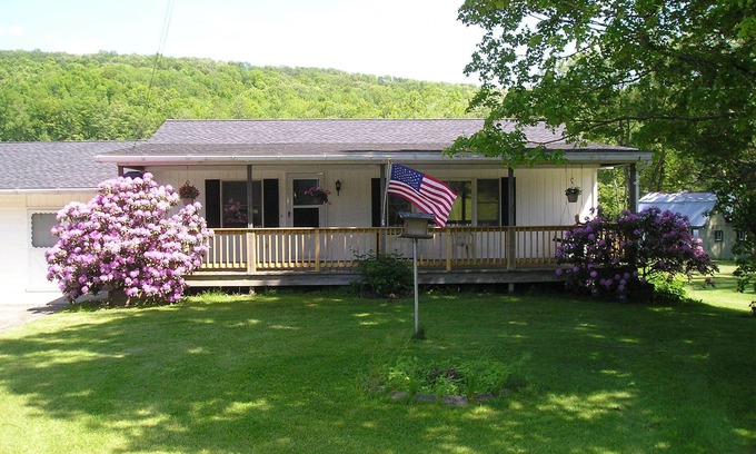 Your Wellsboro Getaway Adventure begins at this 2-bedroom cabin ranch home. Nestled in a serene setting, this marvelous property offers a phenomenal escape for guests. 10 miles from the Tioga County Grand Canyon and only 5 minutes from the Wellsboro Center of Town. The cozy bedrooms have queen size beds. You'll have a restful sleep surrounded by nature's tranquility. The cabin features a living room with an additional queen size sofa bed, providing extra space. The back enclosed porch off of the one-car attached garage - overlooks 2 acres of beautiful scenery & wildlife, along with Spring blooms & Autumn reds, yellows, & orange mountains. Stretch out on the comfortable lounge chairs. Enjoy the back deck. Enjoy the convenience of amenities like air-conditioning, heating, washer, dryer, fully equipped kitchen with coffee maker, microwave, toaster, blender, dishes, pots & pans, utensils, mugs, glasses, tea pot, potholders, kitchen towels, & the list goes on. Just pack up and come. The bathroom is well-equipped with hair dryer, towels, wash cloths, starter soaps, shampoo, bathroom tissue, and cleaner. For young children - we have a highchair, 2 booster seats, & playpen available upon request. Our place will help you feel at home while you're traveling in Wellsboro.