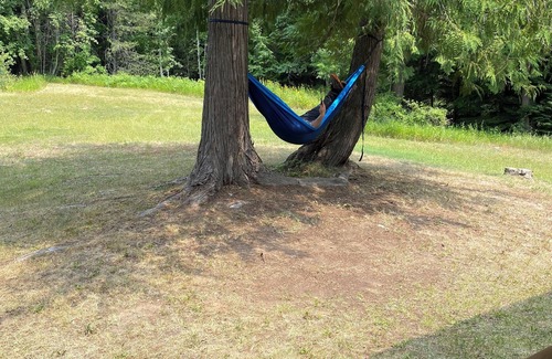 Stay in a spacious yurt nestled in a private forest. Miles of private trails, fire pits, shared outdoor kitchen, outdoor games, and all the nature you can handle await you! Enjoy a spacious interior with a queen bed and desk. We have a second queen bed available if you have more in your party.