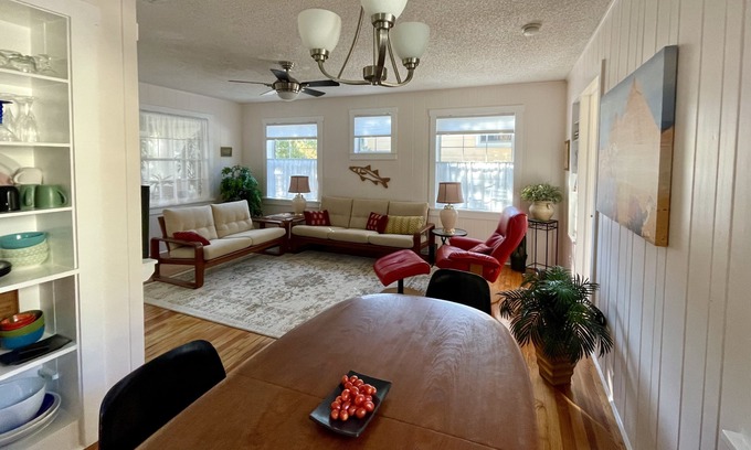 Your picture-perfect Gulfport vacation awaits, at Seven Egrets Cottage. This colorful circa 1938 charmer is a classic. Sun-filled and freshly restored, Seven Egrets allows you to escape the daily grind and immerse yourself in the breezy joys of Gulfport. Welcoming you are the comforts of central air-conditioning, spacious living area, well-equipped kitchen, full bathroom, washer & dryer, WiFi, and two bedrooms: one with a queen size bed and a second bedroom with twin beds. Each room delights with fun details and comfy furniture. In addition to the cheerful and inviting front porch, are two outdoor sitting areas to gather and relax. Seven Egrets is just a block and a half away from Gulfport Beach and a pleasant 3-block stroll from restaurants, shops, galleries and the Gulfport Casino which offers dancing seven nights a week.
