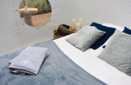 In the shelter of the oaks, warm in your cozy bed, let yourself be lulled by the gentle murmur of nature... Installed on a terrace, in our woods, to enjoy a soft intimacy, the bubbles are semi-opaque and their transparent dome offers a view of the treetops.