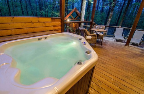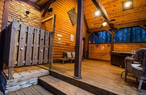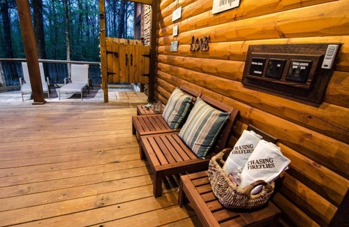 An Adult Only Cabin designed for two people that are madly in love and is a perfect honeymoon cabin or an extraordinary escape! Chasing Fireflies offers seclusion, luxury and elegance in an exquisite studio cabin. The design and care taken with this cabin will truly set the mood for a couple in love. Chasing Fireflies is "A Dream Come True" with so many extra features that it will take your breath away! As you enter Chasing Fireflies you are "wowed" by a 22 ft. vaulted ceiling that is accented with massive wood/iron beams and ceiling fans. This grand entrance is centered with a 3-sided fireplace that divides the living/kitchen area from the bedroom/bath. On the living/kitchen side you'll find comfortable seating facing the fireplace and flat screen TV along with a pool table. The kitchen is tucked in at the back of the cabin with top of line appliances and a granite island with bar seating. A door leads out to the covered porch which offers patio seating and a gas grill for a meal al fresco and rocking chairs to relax in while enjoying your morning cup of coffee. The bedroom/bath side of the cabin is an exquisite blend of comfort and luxury. The king size bed is suspended with iron and rope chains and piled high with soft, cozy bedding and pillows. The bathroom area is like your own personal spa with heated floors and towel rack, a double vanity countertop, heart shaped aromatherapy air tub with forest views, and a walk-in spa shower with two rain showerheads, body sprayers, and glass front. To continue your spa experience, venture out to the private hot tub deck accessed from the bedroom side of the cabin and you'll find a covered hot tub, outdoor shower and sun deck, and best of all, your own personal sauna! Flip the firefly switch when it gets dark out and be amazed at your own personal light show. The grounds of the cabin offer plenty of space to explore the woods, relax by the stacked stone fire pit, or catch a nap in the large rope hammock near the edge of the forest. A deer feeder is nestled deep in the forest just west of the cabin; you'll probably be visited by deer and turkeys, along with the squirrels and rabbits. Chasing Fireflies is the ultimate luxury getaway in the woods and is one of the most romantic places you'll ever stay!