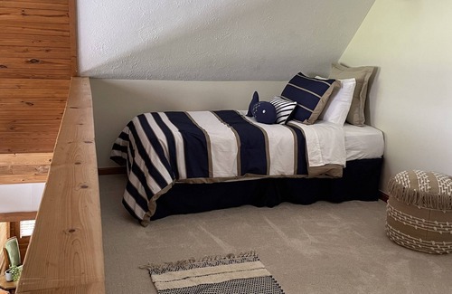 Our family friendly home is a two-story 1,900 square foot home with 2 bedrooms, a loft, sunroom, 2 bathrooms and 2 entertainment spaces. In addition to the living, dining and kitchen, the main floor has sleeping accommodations with the master bedroom (King) and the sunroom with daybed and trundle (2 twins). The main bath with double vanity and large jacuzzi tub and laundry room are also on the main floor. From the loft upstairs enjoy 2 large windows overlooking the neighborhood landing strip and Jonathan Creek. The loft has 2 single beds. Through a door you will find the 2nd bedroom with 2 queen beds, TV and en suite bathroom with shower.