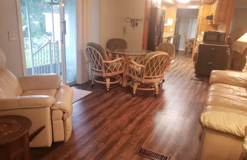 Porch.Enjoy the soothing atmosphere with amenities like AC, WiFi, Hot Tub, kayaks and a washing machine. With 2 bathrooms equipped with showers, your stay will be nothing short of enjoyable. Book now and enjoy everything this mobile home has to offer.
