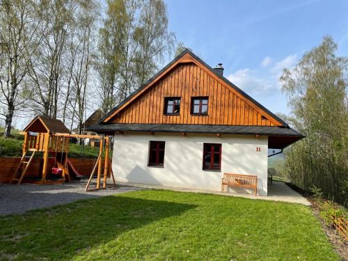 17 miles from Museum of Paper Velké Losiny in Malá Morava, Chata GOLDENBACH offers accommodations with access to a sauna and hot tub. This vacation home features free private parking, a shared kitchen, and free Wifi. The property provides a children's playground and outdoor furniture. The vacation home consists of 4 bedrooms, a living room, a fully equipped kitchenette with a dishwasher and a coffee machine, and 2 bathrooms with a walk-in shower and a hot tub. Towels and bed linen are offered in the vacation home. This vacation home is allergy-free and non-smoking. You can play table tennis and darts at the vacation home, and the area is popular for skiing and cycling. Hiking is possible within the area and Chata GOLDENBACH offers ski storage space. Praděd is 28 miles from the accommodation. Pardubice Airport is 60 miles from the property.