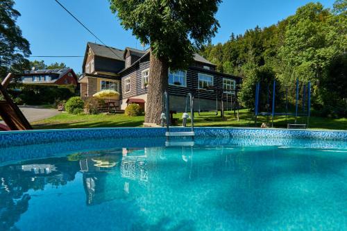Chata Harmonie enjoys a location in Bedřichov, 16 miles from Ještěd and 23 miles from Zittau Goerlitz University of Applied Sciences. This property offers access to table tennis. There's a sun terrace and guests can access free Wifi and free private parking. Some rooms also boast a fully equipped kitchen with a dishwasher, an oven, and a microwave. At the guest house, units have a private bathroom. Buffet and continental breakfast options with fresh pastries, pancakes, and fruit are available. There is a snack bar, bar, and lounge. For guests with children, the guest house features kids pool, an indoor play area, and outdoor play equipment. Guests can swim in the outdoor swimming pool, go skiing or cycling, relax in the garden, and use the barbecue facilities. Szklarki Waterfall is 24 miles from Chata Harmonie, while Kamienczyka Waterfall is 24 miles from the property. Vaclav Havel Prague Airport is 80 miles away.