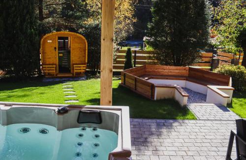 Providing a garden, Chata Na Makově s vířivkou a finskou saunou provides accommodations in Makov. There's a spa and wellness center comprised of a sauna, a hot tub, and a steam room. The villa also features free Wifi, free private parking, and facilities for disabled guests. Featuring a terrace and garden views, the villa includes 2 bedrooms, a living room, cable flat-screen TV, an equipped kitchen, and 2 bathrooms with a hot tub and a shower. Towels and bed linen are available in the villa. There's also a seating area and a fireplace. Guests can make the most of the warm weather with the property's barbecue facilities. Sightseeing tours are available close to the property. Skiing, cycling, and hiking are possible within the area, and the villa offers ski storage space. Lietava Castle is 24 miles from Chata Na Makově s vířivkou a finskou saunou, while Budatin Castle is 26 miles from the property.