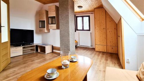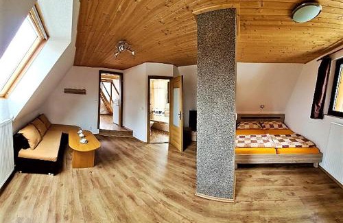 Located in Lipno nad Vltavou, 18 miles from Castle Český Krumlov and 2.8 miles from Lipno Dam, Chata Sandra has accommodations with free WiFi and a garden with a grill and river views. Featuring a terrace or a balcony, all units include a seating area, a flat-screen TV with cable channels, an equipped kitchen, a dining area, and a private bathroom fiitted with a hairdryer. A fridge, an oven and microwave are also available, as well as an electric tea pot. Skiing and cycling can be enjoyed nearby, while a ski equipment rental service, a ski pass sales point and ski-to-door access are also available on site. Main Square in Český Krumlov is 17 miles from the lodge, while Rotating Amphitheatre is 18 miles from the property. Ceske Budejovice Airport is 33 miles away.