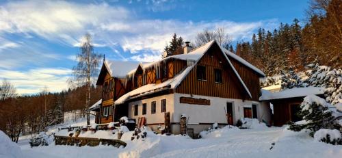 Chata Zákoutí in Vítkovice provides accommodations with a garden, a bar, and a shared lounge. This property offers access to darts. There's a sun terrace and guests can access free Wifi and free private parking. The guest house features some units with pool views, and every unit is equipped with a shared bathroom. A selection of options including warm dishes, fresh pastries, and fruit are available for the buffet breakfast. For guests with children, the guest house provides outdoor play equipment. Skiing, cycling, and hiking are possible within the area, and Chata Zákoutí offers ski storage space. Bus Stop Strážné is 7.6 miles from the accommodation, while Szklarki Waterfall is 24 miles from the property. Pardubice Airport is 66 miles away.