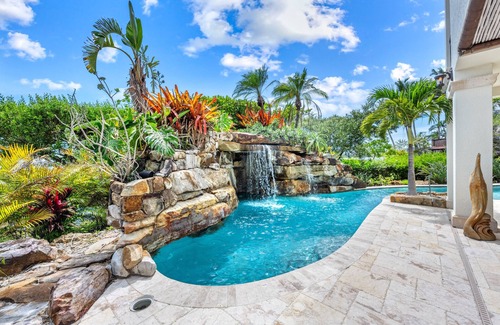 The real magic happens outdoors. Designed by Lucas Lagoons, the custom lagoon-style pool, heated spa, and cascading waterfall create a tropical oasis, while the fire pit and hammock between beachfront palms invite you to slow down and savor the view.