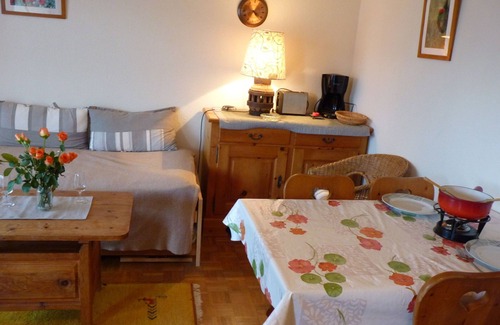 "Châtillon C 16", 2-room apartment 30 m2, on the ground floor, south-east facing position. Simple and practical furnishings: living/dining room with 2 pull-out beds (2 pers. 2 x 90 cm), dining table, cable TV, flat screen and radio. Exit to the garden, to the terrace. 1 room with 2 beds (90 cm). Kitchenette (3 hot plates, oven). Bath/WC. Garden 40 m2, south-east facing position. Terrace furniture, deck chairs (2). Partial view of the mountains. Parking (fenced). Please note: non-smokers only. Maximum 1 pet/ dog allowed.