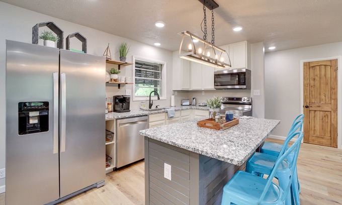 This Checotah vacation rental has all you need for a scenic getaway with the family! You’ll love how close this 4-bedroom, 2-bathroom home is to Lake Eufaula, with water views from the patio and beach access just across the street. Spend your days on the lake or visiting downtown Eufaula for local cuisine, entertainment, or the farmers’ market! At night, relax in the large bedroom suite and enjoy its deluxe en-suite bathroom, featuring a walk-in shower, a standalone tub, and a dual-sink vanity.