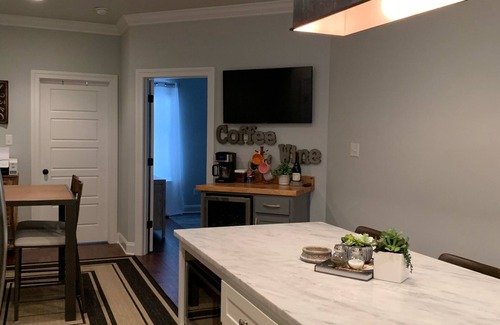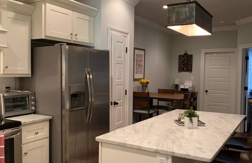 We have a downstairs king master, upstairs king master and a third bedroom with two full beds. All bedrooms have private baths. Hardwood floors throughout. Fully stocked kitchen, wine fridge, kitchen table with seating for 6 plus 3 bar stools at the island. Full size washer and dryer.