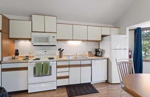 Each one is just a little bit different, but similarly the same. Walk in on the main level to find the treehouse feel in the open area, combination Living Room, Dining Room and Kitchen with views nestled in the trees and lake side. The Living Room includes a flat screen TV, wireless internet and access to the deck. Dining and Kitchen will have plenty of seating for your group and all the accoutrements of home. They include full sized refrigerator, range, microwave, dishwasher and other small appliances such as toasters and blenders. Also located on the main level is the King bedroom. This bedroom features a flat screen TV, full bathroom and stack washer and dryer.