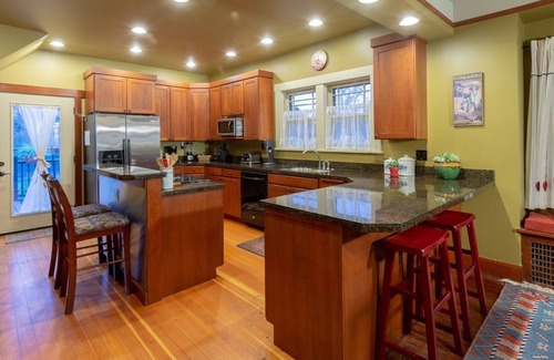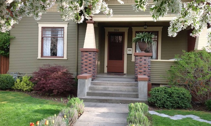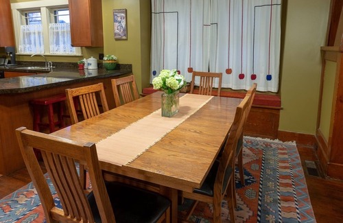 Our guests step in the door and fall in love with the warmth and spirited charm of our own Casa Cavatappi ('Corkscrew House' in Italian), a restored 1922 Craftsman house in an established residential neighborhood and furnished as lovingly as a permanent residence, within walking distance of downtown Walla Walla and Whitman College. Accommodates up to 8 people, with 4 bedrooms (3 with queen size beds and 1 with two twins), plus two single size sofa beds and a trundle bed. Has 3 bathrooms, one on each floor. With a bedroom and bath on the main floor, the house is a cozy retreat for 2 people. For a larger group's enjoyment spaces are designed for socializing and group activities as well as for finding quiet private time. A large TV/activities room is located downstairs, separate from main floor. A fully equipped kitchen that serves for daily family meals or gourmet dining. A lending pantry of basic cooking ingredients. A dining table that expands to serve up to 10 and two kitchen bars with stools for informal meals or conversation. A deck with barbecue, table set and sun umbrellas overlooks a fully fenced back yard. Off street parking for 3 vehicles plus ample street parking. Dog friendly with some restrictions. Wireless cable internet.