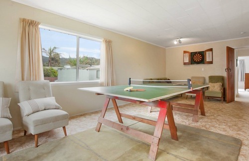 Just metres from the pristine beach - you'll have sand between your toes in 20 seconds!! This large six bedroom house is ideal for a family getaway or perfect for a two-family adventure!! Upstairs offers laid-back coastal vibes, with a kitchen and open plan living and dining. Straight off the lounge is a wonderful deck overlooking the bay and children's playground below. Also on this level are three bedrooms plus a bathroom. Relaxed holiday living continues on the ground level, with a large games room (with pool table & table tennis!!) plus three additional bedrooms, a bathroom/laundry combo and a separate toilet.
