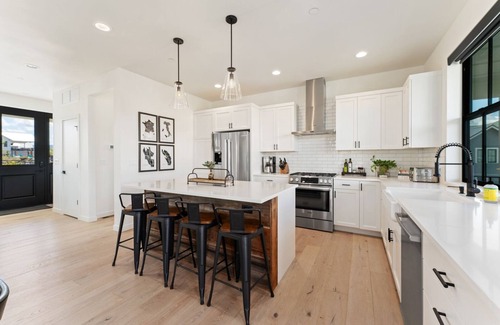 The home has a modern gourmet kitchen with upgraded Bosch appliances and numerous dining areas. Guests can dine at the kitchen island, kitchen pass-through window bar, main level indoor and outdoor dining tables, lower level dining table, and 3 convertible picnic tables/benches in the covered breezeway patio. The upper level king suite porch is a cozy place to enjoy breakfast and coffee or an evening glass of wine.