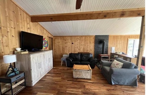 The cottage features stunning lake views, propane furnace, AC, year round access, a modern kitchen with all the amenities, comfortable new beds, and a living area with a big-screen TV and wood stove for cozy nights in. Outside, enjoy BBQs and evenings by the fire pit under the stars.