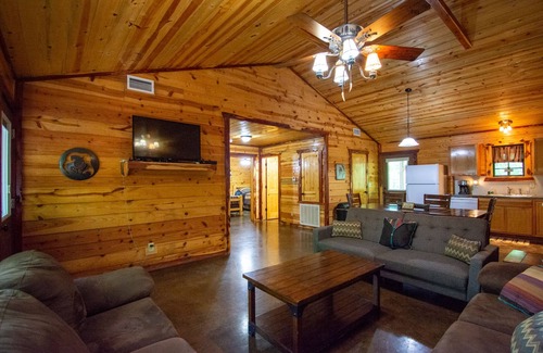 Nestled in the Ouachita National Forest, this 2 bedroom 2 bath beautiful lodge is the perfect place to stay for a large family or a group of friends! Large parking for several trucks & trailers. Once you're here, unload those rides & park the trailers as you won't need them until time to go home. You can ride to Wolf Pen Gap, Fourche Mountain Trails, Cossatot River, and much more. You also have miles & miles of National Forest roads to ride. Beautiful scenery, wildlife, and lots of fun!