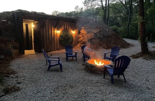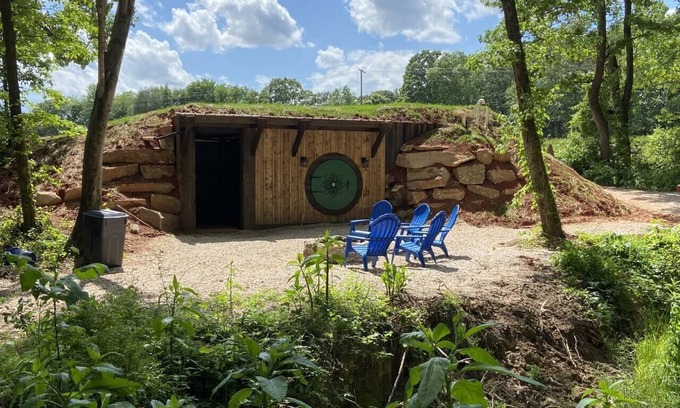 This is the 2nd "Hobbit House" on the Cherry Treesort property. It's a spacious 395 sq feet with a queen bedroom, circle door entry, living room with a queen sofa bed, and a full bathroom. The Hobbit House sits on 27 acres with the 8 other treehouses we have built. We also have a playground for kids and a 70 foot jump pillow for all to enjoy. Come stay in one of the most unique stays in the country, you wont be disappointed.