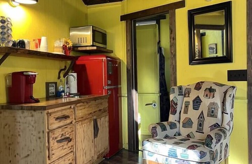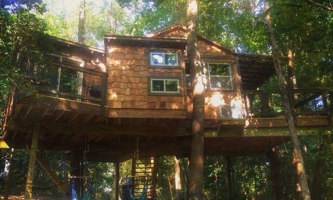 This beautiful treehouse is the 4th on the Cherry Treesort property. It is located at the back of the farm with plenty of parking. It features a queen bed in the main bedroom, a pull out couch bed and a set of bunk beds. It has a complete bathroom with flushing toilet and shower. It also has a microwave, toaster, Keurig, and fridge. Heat and AC are also a luxury in this house. On the grounds outside the property we have a great rustic fire pit with plenty of outdoor swings and hammocks.