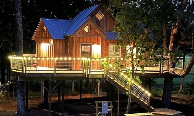 Welcome to "The Trevor". This is a special treehouse that sleeps up to 8 guests. It features a queen bedroom, four bunk beds and a sofa couch in the main room. At 400 square feet it has plenty of room to move about and has a huge front deck wrapping around the sides. Nestled along the East treeline of the farm, The Trevor provides shade most of the day but has a great view of the sun rising and setting. This house also has its own swings and fire pit to complete your experience.