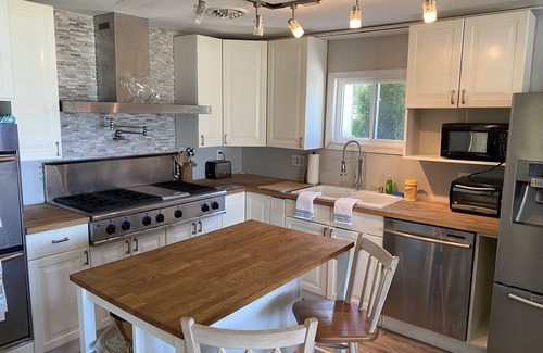 Cottage A features a large kitchen and main living area overlooking the creek. This unit has 1 Queen bed and a sofa (non-pullout) for sleeping.