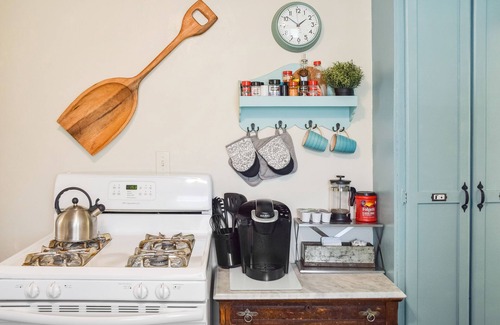 You will find a fully loaded kitchen with everything you will need to cook meals during your stay. We will have tea, coffee, cream, hot cocoa & sugar available. The kitchen is also loaded up with pots, pans, bowls, a strainer, utensils, fridge, gas range and oven, microwave, toaster, coffee maker, hand mixer, blender and a kettle. Additional cooking supplies, such as spices, are on the shelf next to the stove and in the upper cabinet next to the fridge. Cleaning supplies and extra trash bags are under the sink. There is a broom, dustpan and mop in the West bedroom closet.