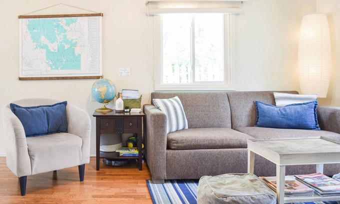 To help you relax after a long day of exploring, the cozy living room boasts a television with Roku, Netflix and local channels as well as games, books and toys for the little ones. The living room also includes an expandable dining set for your family meals.