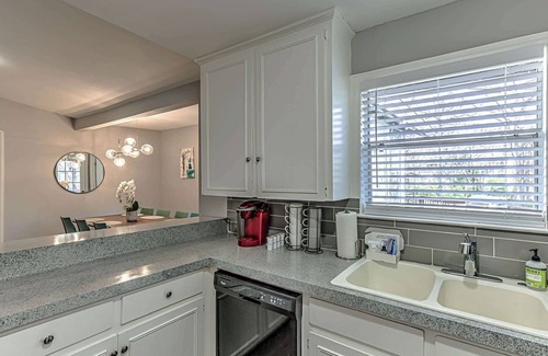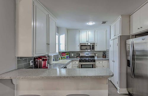 Planning on cooking for the crew? The fully equipped kitchen is a dream, featuring sleek stainless steel appliances, ample counter space, and white cabinetry stocked with all the essentials. Prepare a home-cooked meal and gather around the dining table for eight. The kitchen also offers convenient counter seating for two, perfect for a quick breakfast or chatting with the chef. Start your mornings right with the Keurig coffee station before heading out to explore nearby attractions like the Boardwalk at Lady Bird Lake or the trendy bars and shops of East Cesar Chavez.