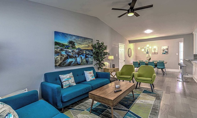 When you arrive, you’re met with a spacious and inviting living room, thoughtfully designed for relaxation and entertainment. With two plush couches, two cozy armchairs, and a smart TV, it's the ideal spot to unwind with friends and family after a day of exploring Austin’s vibrant streets. Whether you're streaming your favorite shows or sharing stories with loved ones, the warm and comfortable atmosphere makes it easy to feel at home.