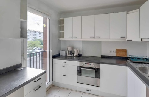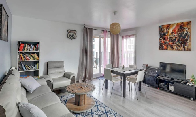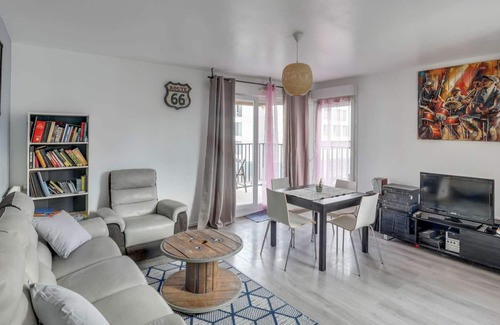 For sleeping, there are 2 bedrooms in the flat, each with a double bed and a cot in one of them. There is also a spacious balcony with outdoor furniture to get some fresh air or just admire the scenery. Accessible to disabled people, it is ideal for your leisure activities, your business trips and your holidays in the Paris region.