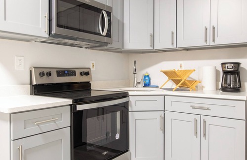 While you're here, you can enjoy all the comforts of home and more, including a refrigerator and an oven, as well as a stovetop and a dishwasher. Other amenities include towels, kitchenware and utensils, soap, and toilet paper.