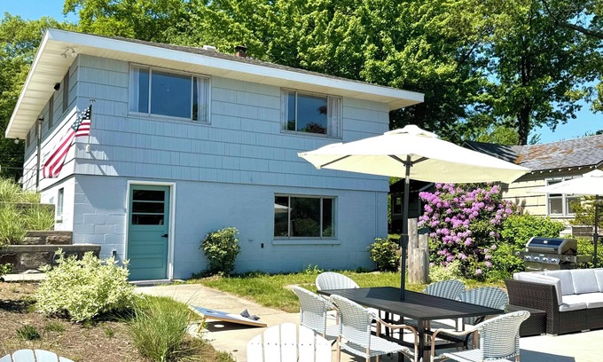Open living/ kitchen/dining space with three bedrooms and full bath on the main floor. Downstairs has a tv/rec room, an additional bedroom with queen bed, full bathroom with tub and walk-in shower and laundry. Minutes away from Lake Michigan, restaurants, bars, golf and more. Boat and bike rentals available nearby. Two kayaks included. Walkable to restaurants, ice cream, parks with playgrounds. So much to enjoy!