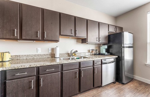 Our 580 sqft 1-bedroom king suite apartment comes standard with a fully-stocked kitchen, dedicated work space, comfy couch, pickleball court, courtyard w/ grills, washer and dryer, fast wifi, & 24-hour gym to accommodate you in the modern times.
