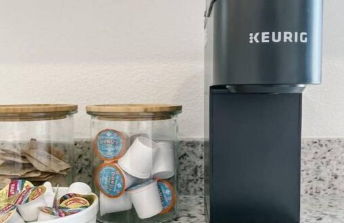 Professionally designed, the space features polished concrete floors, a queen-sized bed, a modern kitchen with stovetop and complimentary coffee, a dining table, fast wifi, a 40" TV, loveseat, private back patio, and a sleek bathroom.