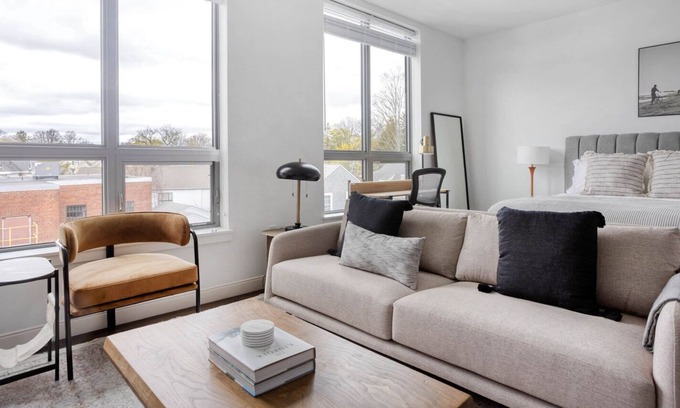 Chic studio w/ Gym, W/D, Steps from Newtonville Train by Blueground | Apartment in Boston