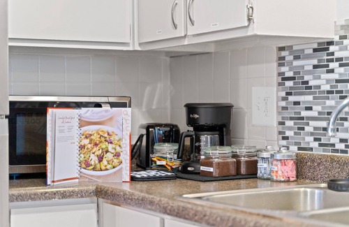 • Fully stocked kitchen with plenty of pots and pans, chef knives, cooking utensils, cups, plates, coffee and tea mugs and wine glasses which makes this a great place for a long-term stay