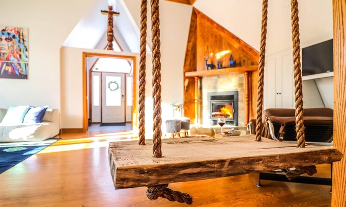 Our unique decor, with its large living spaces and indoor swing, is bound to impress you! Its many windows offer a magnificent view of the forest that surrounds the cottage and bring a beautiful light inside.