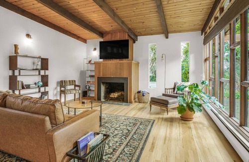 Wood floors, exposed beams, and large windows overlooking the lush courtyard create a warm and welcoming vibe in the living area. Curl up by and unwind with a good book or watch a movie on the TV.