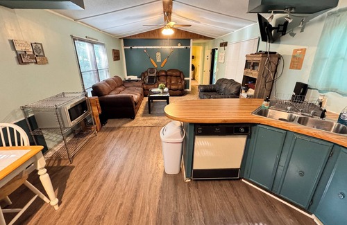 The hybrid living room bedroom will be the first room entered as you open the door .Before opening the front door, you will walk up some stairs to a covered deck. This room has a queen bed. Also within this room is a couch with a fold out bed, a loveseat, a recliner, and a flat screen TV. As you exit this room, you will enter the main living area.